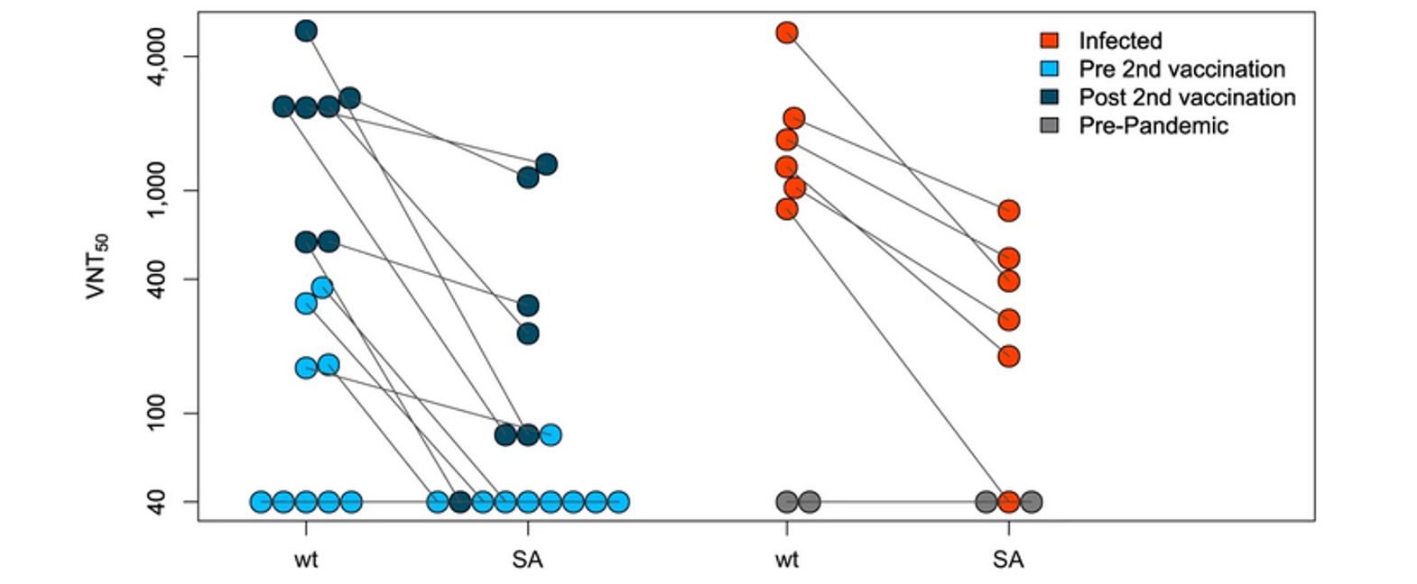 Bild: In einem Experiment wurde untersucht, wie effizient das SARS-CoV-2 Wildtyp Virus (wt) oder die neue „Südafrika“-Variante (SA) durch Antikörper neutralisiert, also abgetötet werden können. Dazu wurden Antikörper aus dem Blutserum von infizierten Personen (rot), Personen mit Erstimpfung (hellblau), Personen mit Zweitimpfung (dunkelblau) oder Personen die weder infiziert noch geimpft waren (grau) untersucht. Je höher der „virus neutralization titer“ (VNT) desto besser kann das Virus abgetötet werden. Die grauen Verbindungslinien zwischen identische Blutseren zeigen, dass alle Blutseren die „Südafrika“-Variante schlechter neutralisieren können als das Wildtyp Virus.