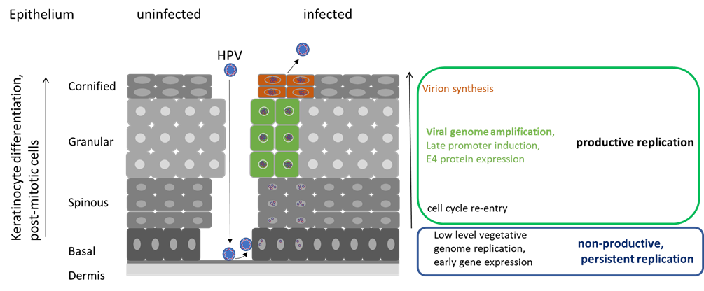 HPV infect and complete their replication cycle in keratinocyte cells that are the main constituents of mucosal and cutaneous epithelium. In basal epithelial cells low levels of HPV genome replication and expression of early viral gene products can be observed. Production of infectious HPV occurs only in the upper layers of the infected epithelium.