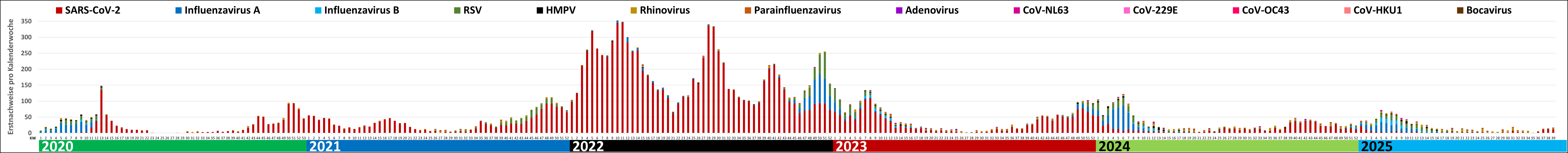 Die folgenden Abbildungen zeigen die Anzahl der molekularbiologischen „Erstnachweise“ der wichtigsten respiratorischen Viren in domo in Abhängigkeit der Kalenderwoche (nach ISO 8601), wobei die Kriterien für einen „Erstnachweis“ des betreffenden Erregers erfüllt sind, sofern in den zwölf Wochen zuvor bei uns im Institut für Medizinische Virologie kein Nachweis für dieses Virus vorlag. Dabei kann es durchaus sein, dass der Virusnachweis extern bereits erfolgt war.