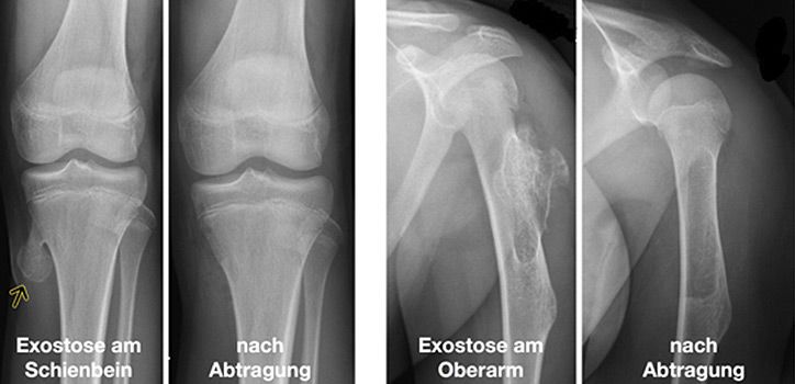 Unter Exostose versteht man eine abgegrenzte Zubildung von kompakter Knochensubstanz mit Wachstum nach außen. Sie können an den verschiedensten Knochen auftreten und ein breitbasiges oder spornhaftes Wachstum aufweisen. Bei der sogenannten Exostosenkrankheit treten viele verschiedene Knochentumoren auf, bei denen eine bösartige Entdifferenzierung nicht vollkommen ausgeschlossen ist. In der Regel finden sich jedoch einzelne Exostosen, insbesondere am Knie, die mit der chirurgischen Entfernung bei o.g. Beschwerden therapiert sind.