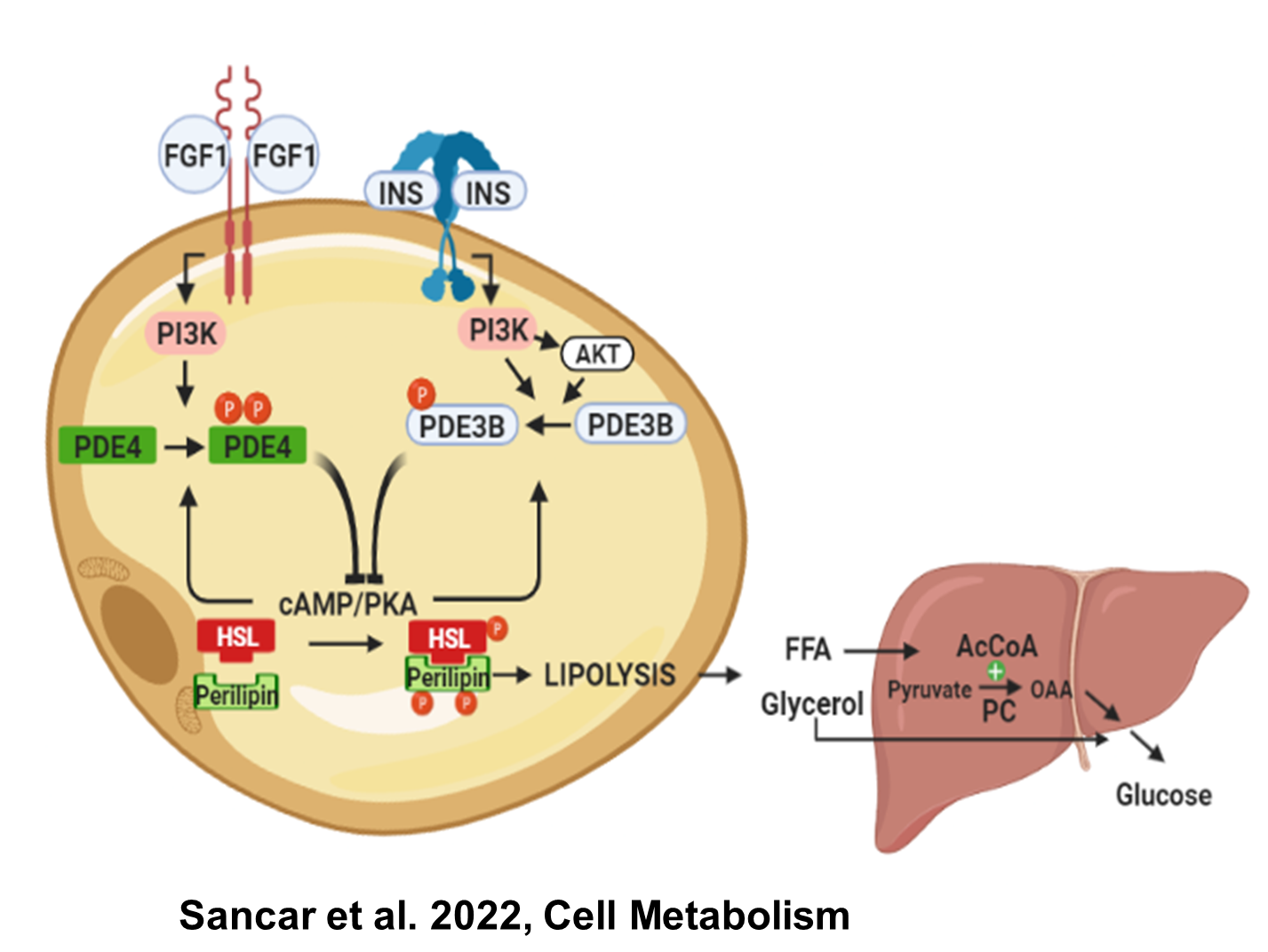 Previously, we identified a distinct FGF1 signaling pathway that mirrors insulin’s ability to suppress adipose lipolysis and hepatic glucose production (HGP). Specifically, FGF1/FGFR1 signaling in adipocytes activates PDE4D, leading to a reduction in cAMP levels and consequently decreased PKA activity. This results in diminished phosphorylation and translocation of hormone-sensitive lipase (HSL), effectively suppressing lipolysis. Now, we focus on further dissecting the signaling mechanisms by which the FGF1/PDE4D axis inhibits lipolysis, and we aim to define the in vivo contribution of adipose PDE4D to metabolic regulation, particularly its role in controlling lipolysis and HGP.