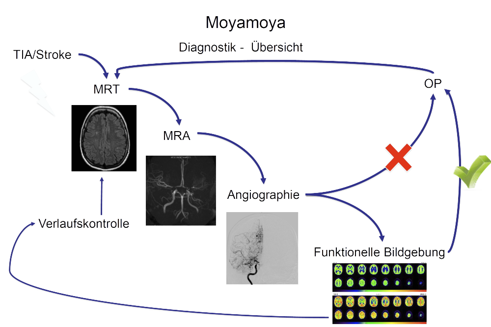 In der konventionellen Angiographie und im konventionellen MRT können selektiv die Gefäße, der Blutfluss, und das Gewebe gut dargestellt werden. Diese Untersuchungen erbringen jedoch keine Aussage über den absoluten Blutfluss im Gehirn. Adaptierte Untersuchungen des MRTs, sowie auch des CTs zur Messung der Hirndurchblutung (Perfusion) haben sich in der Vergangenheit bei Moyamoya Betroffenen auf Grund der Kollateralen als zu wenig sensitiv gezeigt, um die Durchblutung zuverlässig darzustellen.