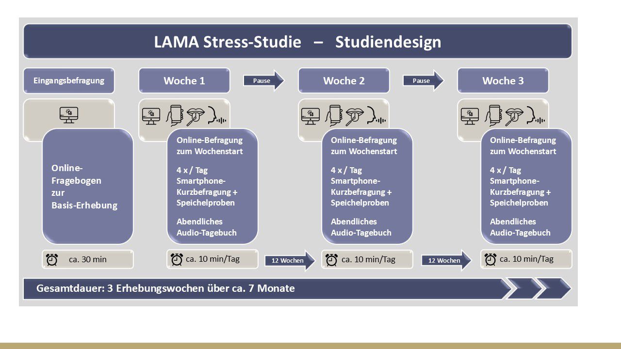 Im Rahmen der LAMA Stress-Studie soll untersucht werden, wie aus wiederholtem, akutem Stress im Alltag langfristig chronischer Stress werden kann – und was dabei im Körper passiert. Bisher wurde meist nur einer dieser Stressarten einzeln untersucht. LAMA möchte jedoch erforschen, wie sich chronische und akute Stresszustände gegenseitig beeinflussen und wie sich verschiedene Menschen in deren Erleben unterscheiden.