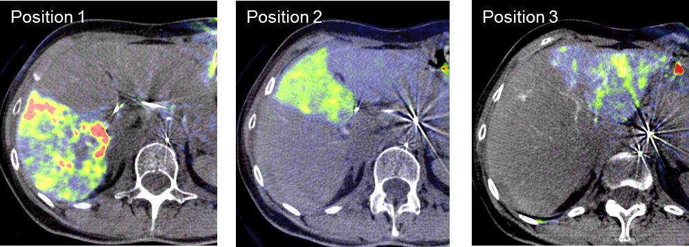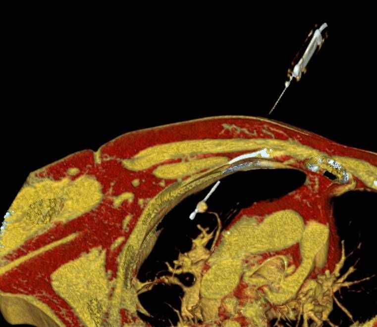 Abbildung: Bei der perkutanen Thermoablation von Lungentumoren werden spezielle Applikatoren unter CT-Bildgebung in den Zieltumor eingebracht. Durch Hitze wird der Tumor dann zerstört.