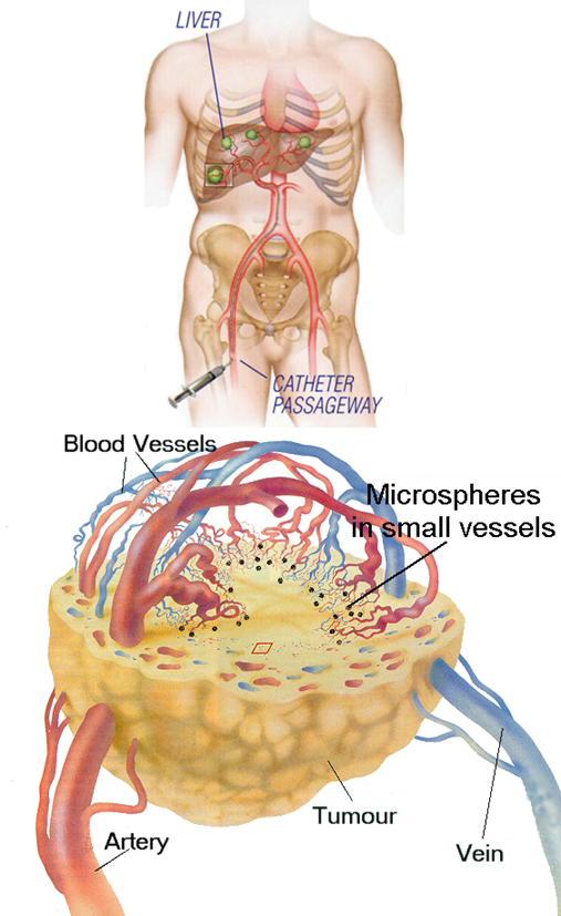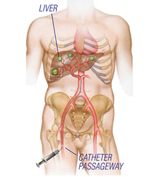 Über die Leistenarterie wird in Lokalanästhesie ein dünner Katheter (Schlauch) in der Leber platziert. Über den Katheter werden Partikel verabreicht, die die Gefäßversorgung des Tumors unterbinden, und die gleichzeitig mit einem Chemotherapeutikum beladen sind, welches über mehrere Tage auf den Tumor einwirkt und diesen verkleinern soll.