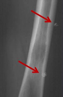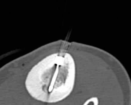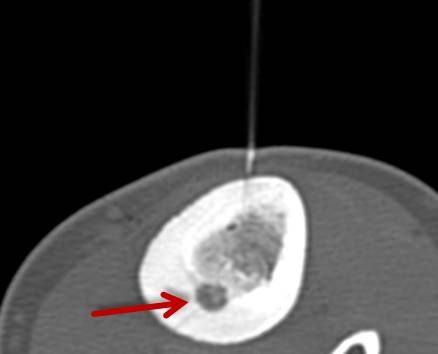 Abbildung: Osteoidosteom (Pfeil) im Schienbein bei einem jungen Patienten. Unter CT-Bildgebung wird ein spezieller Applikatoren unter CT-Bildgebung in das Osteoidosteom eingebracht. Durch Hitze wird dieses effektiv und dauerhaft zerstört.