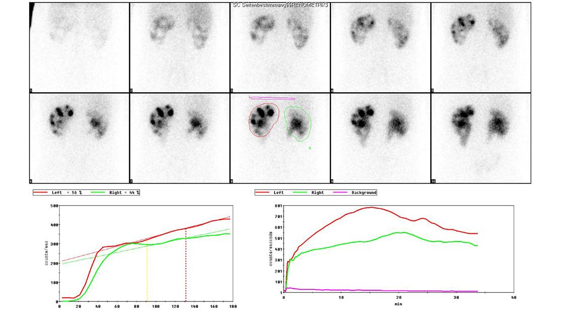 Für die Untersuchung spritzen wir dem Patienten eine geringe Menge einer schwach radioaktiv markierten Substanz in die Vene. Dieses Medikament wurde vorab so aufbereitet, dass es sich ganz gezielt in der Niere anreichert. So erlaubt es uns, die Niere und die ableitenden Harnwege darzustellen.