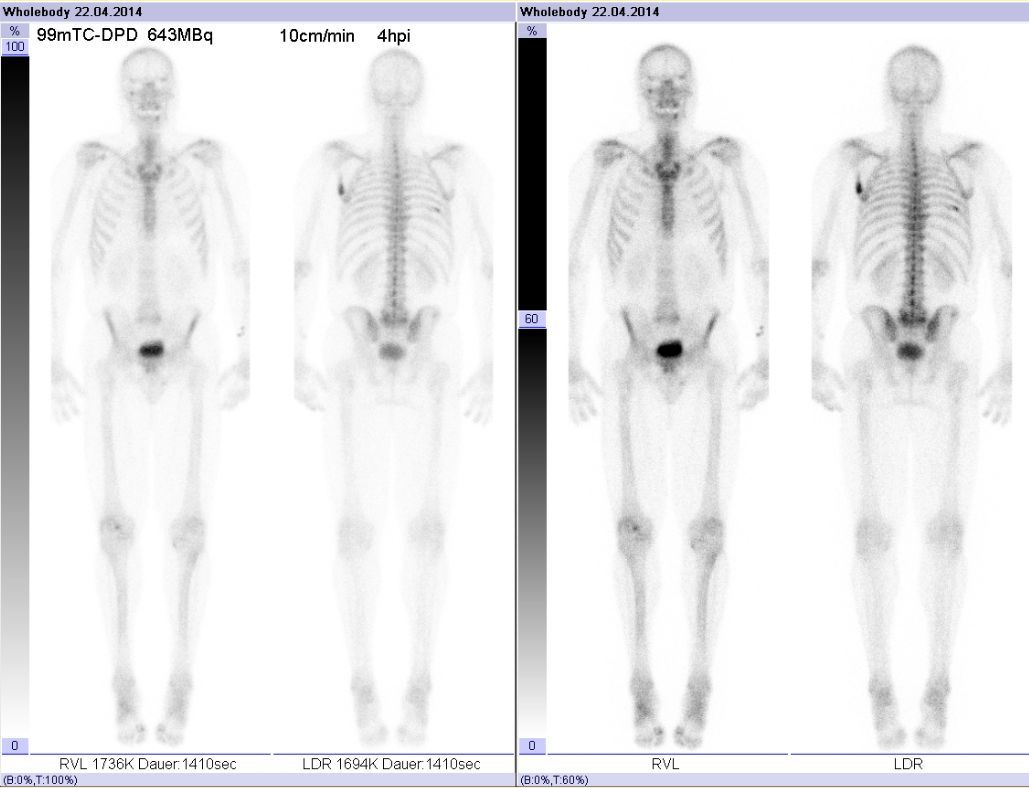 Mit einer Skelett-Szintigraphie können wir Knochen und Gelenke untersuchen. Wir nutzen sie beispielsweise um Gelenksentzündungen bei einer Totalendoprothese zu untersuchen oder Metastasen in Knochen zu finden. Solche Metastasen könnten die Folge von z.B. Prostata- und Brustkrebs sein.
