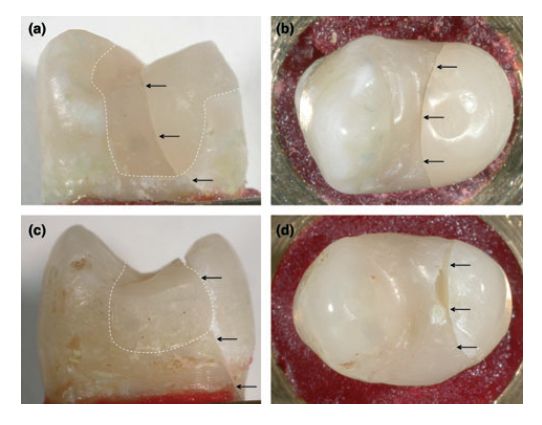 Die Pfeile zeigen die Frakturlinie, die an der Verbindungsstelle zwischen Zahn und Komposit beginnt und unterhalb der Schmelz-Zement-Grenze endet.