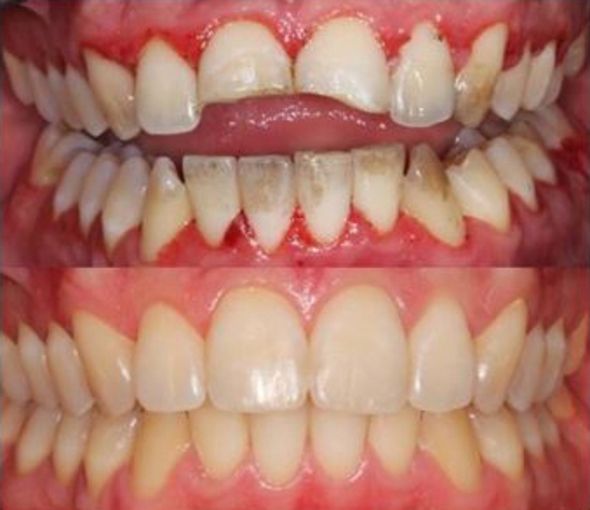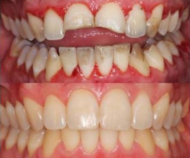 Teilweise empfiehlt sich in der Front der Einsatz von sog. Keramikveneers (Verschalungen). Hierzu wird die Oberfläche des Zahnes leicht abgetragen und in einer zweiten Sitzung das Veneer auf die Zähne geklebt.