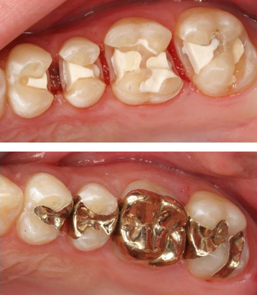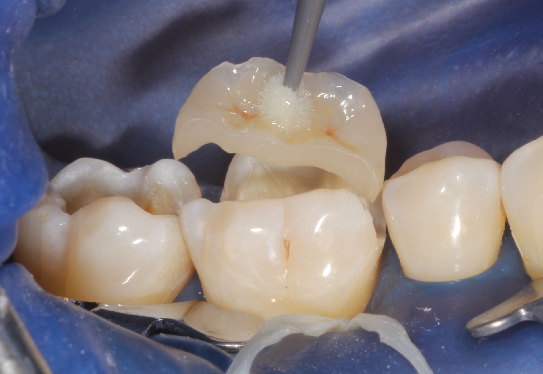In einer weiteren Sitzung werden die fertigen Restaurationen eingesetzt. Im Falle von Gussmetall werden die Restaurationen i.d.R. mit einem Zement befestigt. Im Gegensatz dazu, werden Keramikrestaurationen adhäsiv befestigt eingeklebt.
