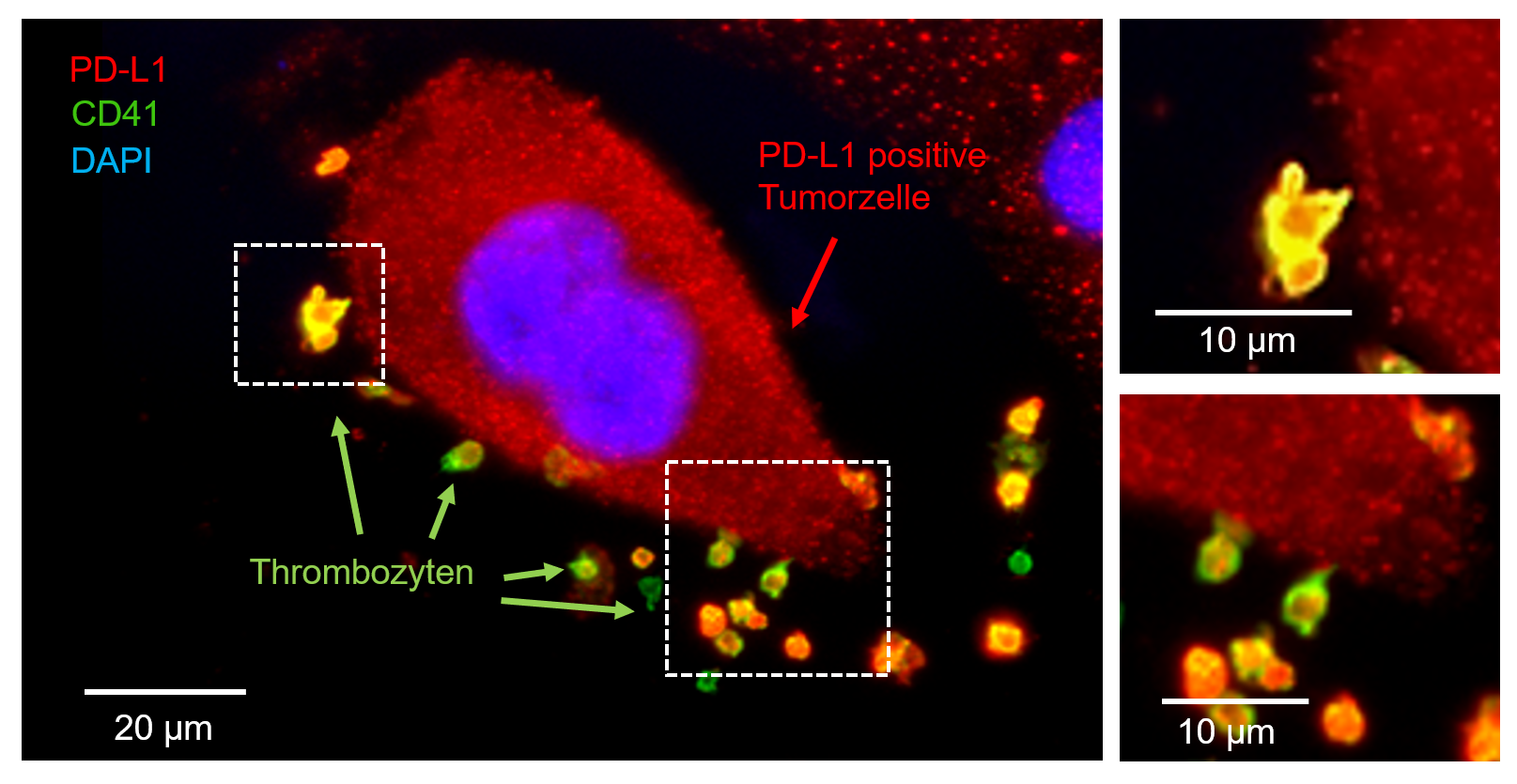 Platelets interact with a lung tumor cell, taking up the molecule PD-L1. © University Hospital Tübingen