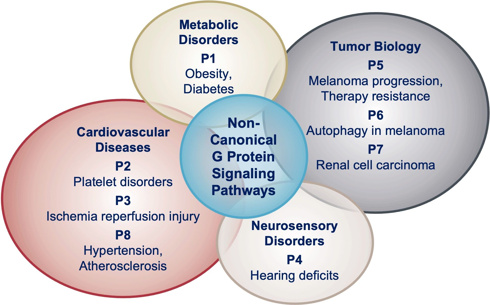 Der zentrale Fokus unseres Graduiertenprogramms liegt darin, bestehende Wissenslücken zum Verständnis ausgewählter nicht-kanonischer Signalwege zu schließen. Im Mittelpunkt stehen dabei Ziliopathien, kardiovaskuläre, metabolische, onkologische und autophagische Erkrankungen. In jedem Projekt richten wir unsere Aufmerksamkeit auf Prozesse der funktionellen Kommunikation zwischen G-Proteinen und i) Arrestin-GPCR-Adaptern, ii) Aktivatoren der G-Protein-Signalübertragung (AGS), iii) Nukleosid-Diphosphat-Kinasen (NDPK, NME) sowie iv) Regulatoren der G-Protein-Signalübertragung (RGS). Diese Interaktionen sind für die genannten Erkrankungen von großer Bedeutung. Daher soll diese interdisziplinäre Forschung Nachwuchswissenschaftler/-innen die Möglichkeit bieten, vielversprechende neue therapeutische Strategien zu entwickeln.
