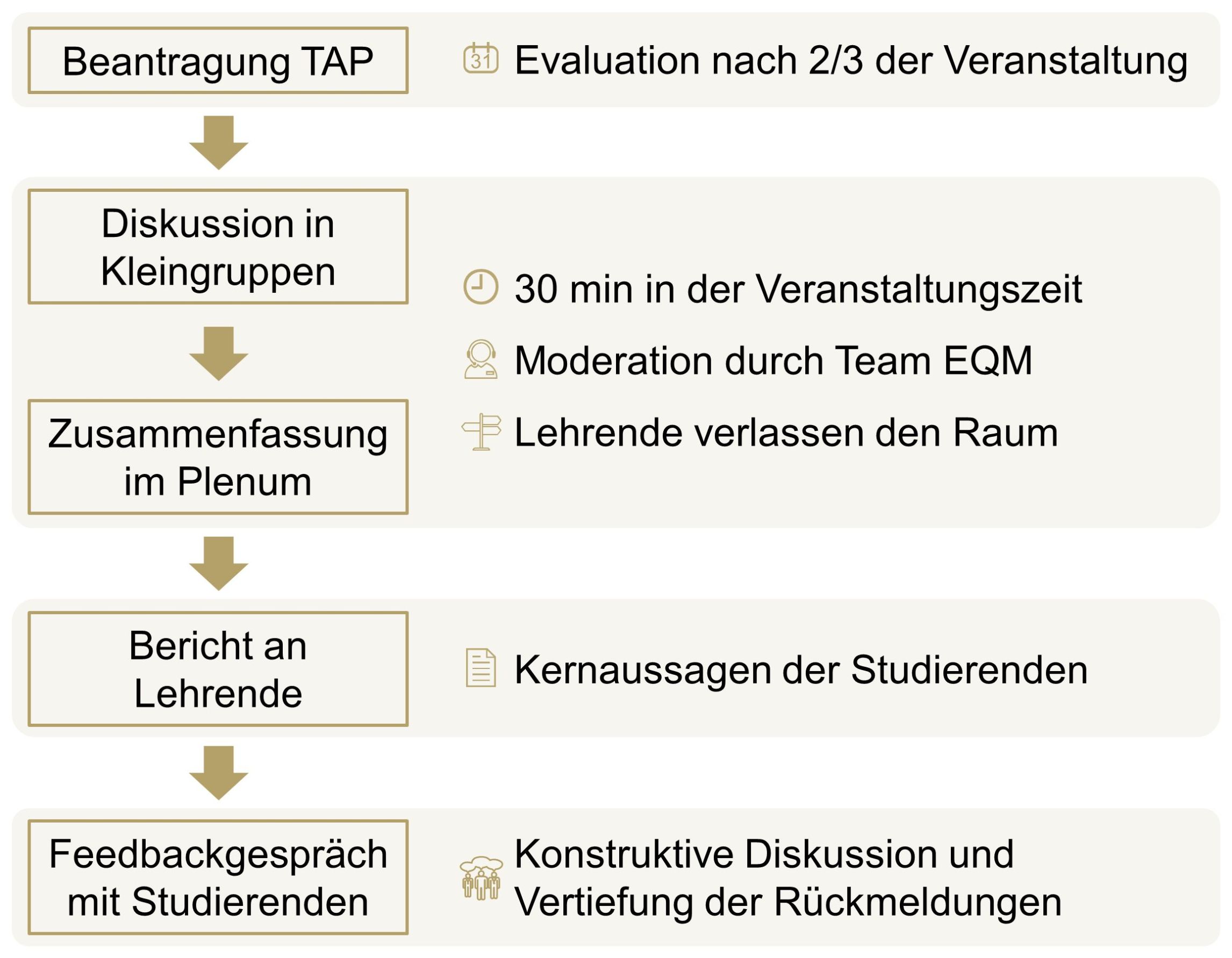 Das TAP ist eine qualitative Methode der Veranstaltungsevaluation. In einer moderierten Gruppendiskussion können die Studierenden Rückmeldung zur Qualität der Unterstützung ihres Lernprozesses geben.