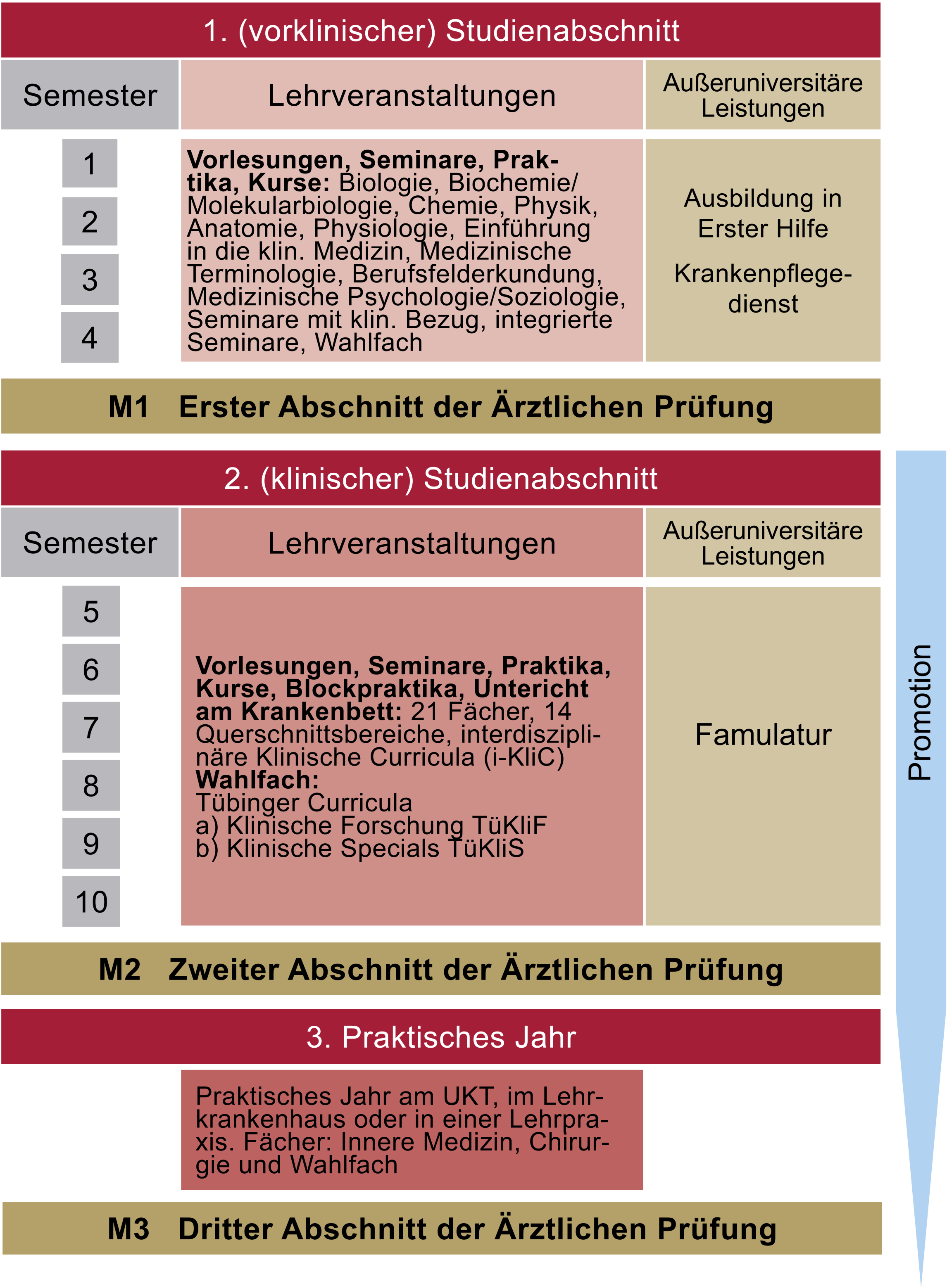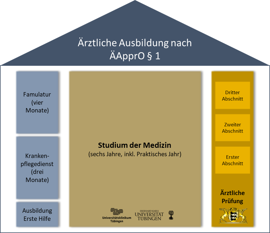 Die ärztliche Ausbildung besteht aus mehreren Teilen, die alle erfolgreich absolviert werden müssen, um die Approbation zum Arzt/ zur Ärztin – d.h. die staatliche Erlaubnis zur Ausübung der ärztlichen Tätigkeit – zu erhalten. Den größten Teil umfasst dabei (1) das Studium der Medizin, das im Regelfall sechs Jahre dauert und eine zusammenhängende Ausbildung (Praktisches Jahr) beinhaltet. Unabhängig vom Studium müssen zudem (2) eine Ausbildung in Erster Hilfe, (3) ein dreimonatiger Krankenpflegedienst und (4) Famulaturen im Umfang von vier Monaten im Rahmen der Ärztlichen Ausbildung absolviert bzw. nachgewiesen werden. Neben mündlichen und schriftlichen Prüfungen, die im Zuge des Studiums an der Universität Tübingen ablegt werden, gibt es noch (5) die staatliche Ärztliche Prüfung, die in drei Abschnitte unterteilt ist und jeweils am Ende des Vorklinischen und Klinischen Studienabschnitts, bzw. nach dem Praktischen Jahr abzulegen ist. Diese staatlichen Prüfungen werden für die Medizinstudierenden in Baden-Württemberg durch das Regierungspräsidium Stuttgart verwaltet.