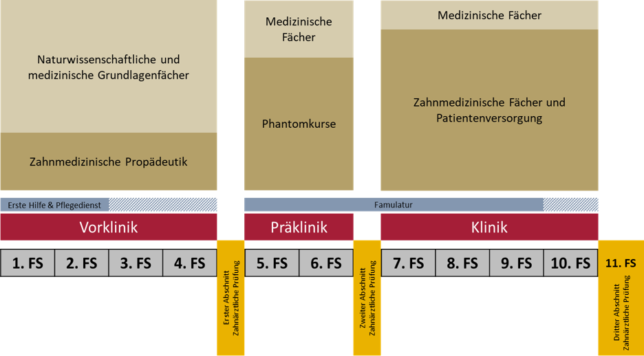 Die zahnärztliche Ausbildung besteht aus fünf Teilen die alle erfolgreich absolviert werden müssen, um die Approbation zum Zahnarzt/ zur Zahnärztin – d.h. die staatliche Erlaubnis zur Ausübung der zahnärztlichen Tätigkeit – zu erhalten: den größten Teil umfasst dabei (1) das Studium der Zahnmedizin, das im Regelfall fünf Jahre dauert und mit einem zusätzlichen Examenssemester abgeschlossen wird. Unabhängig vom Studium muss zudem (2) eine Ausbildung in erster Hilfe, (3) ein einmonatiger Pflegedienst und (4) eine Famulatur im Umfang von vier Wochen im Rahmen der Zahnärztlichen Ausbildung absolviert bzw. nachgewiesen werden. Neben mündlichen und schriftlichen Prüfungen, die im Zuge des Studiums an der Universität Tübingen ablegt werden, gibt es noch (5) die staatliche Zahnärztliche Prüfung, die in drei Abschnitte unterteilt ist und jeweils am Ende des Vorklinischen, Präklinischen und Klinischen Studienabschnitts abzulegen ist. Diese staatlichen Prüfungen werden für die Zahnmedizin-Studierenden in Baden-Württemberg durch das Regierungspräsidium Stuttgart verwaltet.