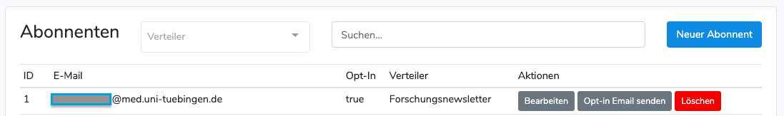 Im Newsletter-Tool werden Abonnenten werden über den Menüpunkt "Abonnenten" verwaltet. Hierbei gibt es mehrere Features: