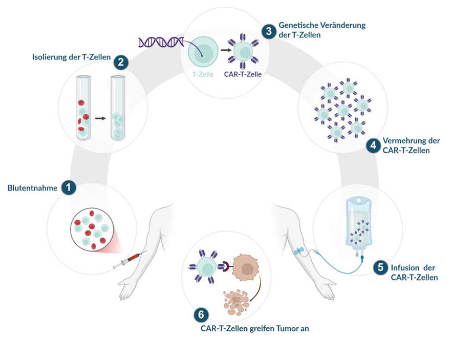 CAR-T-Zellen entfalten ihre Wirkung, indem sie das Immunsystem gezielt gegen Tumorzellen aktivieren. Diese starke Immunantwort kann jedoch in manchen Fällen zu einer Überreaktion führen. Dabei können systemische Entzündungsprozesse entstehen, die im Extremfall Organfunktionsstörungen verursachen können. Die häufigste Nebenwirkung ist das sogenannte Zytokinfreisetzungssyndrom (Cytokine Release Syndrome, CRS). Dabei schütten die aktivierten Immunzellen große Mengen entzündungsfördernder Botenstoffe – sogenannte Zytokine – aus. Typische Symptome sind Fieber, Schüttelfrost, niedriger Blutdruck, Atembeschwerden oder Hautausschläge. Auch neurologische Nebenwirkungen sind möglich. Diese können sich etwa in Form von Sprachstörungen, Verwirrtheit oder temporären Gedächtnisproblemen äußern. In der Regel bilden sich diese Symptome jedoch nach wenigen Tagen vollständig zurück.