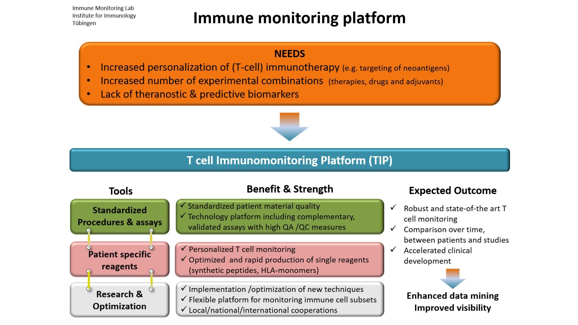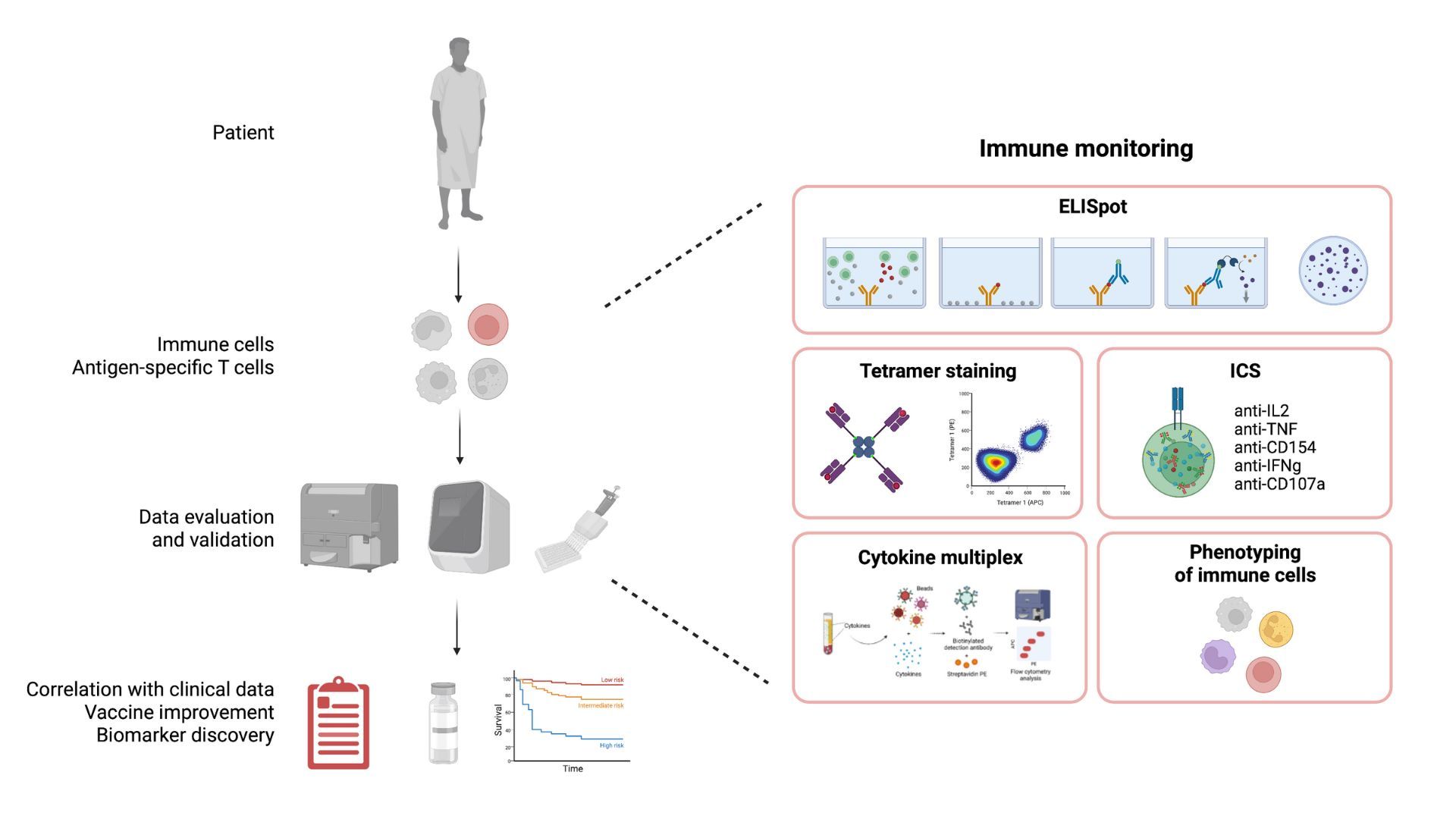 The aim of the immune monitoring team is to contribute to the understanding of immune responses against cancer and to apply this knowledge in immunotherapy. We are focusing on the description of anti tumor T cell responses in cancer patients, either before or during therapy, including immunotherapy. We investigate subsets of T cells at the phenotypic and functional levels, in the blood of cancer patients and also within the tumor tissue. We also assess other immune cell subsets interacting with human tumors and their impact on T cells and clinical course. Finally, we are currently identifying tumor antigens for small cell lung carcinoma.