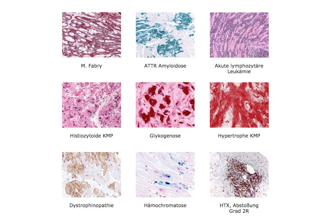 Die Untersuchungen erfolgen in der Synopsis von histologischen Routine- und Spezialfärbungen (inkl. Speicherkrankheiten), Immunhistologie (u.a. Entzündungsmarker bei Myokarditis) an Formalin-fixierten, Paraffin-eingebetteten EMB sowie molekularpathologischer Untersuchungen, welche an Paraffin-eingebetteten, aber auch an gefrorenem und RNAlater-fixiertem Gewebe erfolgen können. Bei kardialen Amyloidosen werden immunhistochemische Färbungen zur Subtypisierung der Amyloidose durchgeführt.