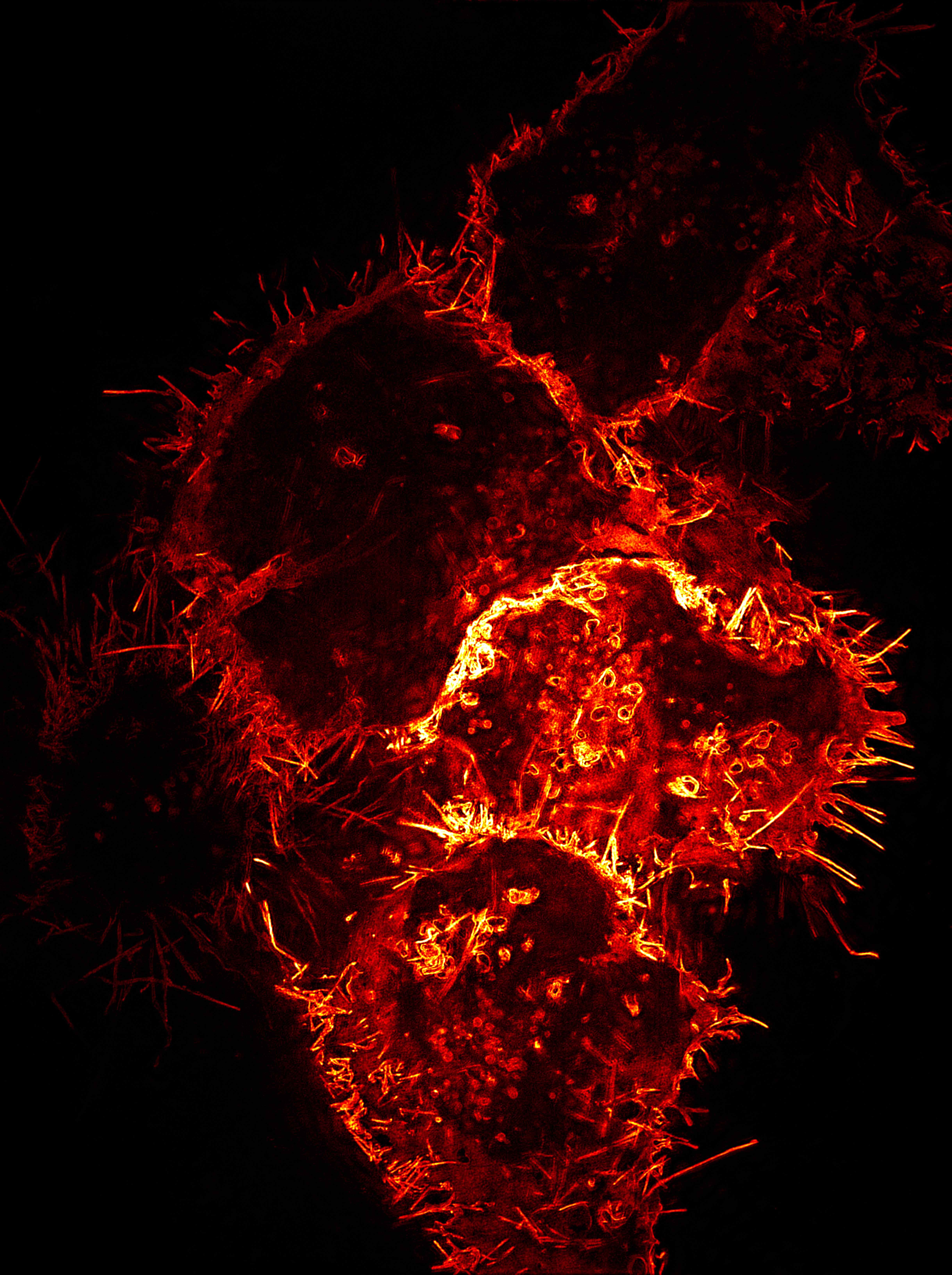 We have the unique possibility for superresolution live cell imaging in our BSL-3 lab. We use the General Electric Delta Vision OMX SR microscope. With this cutting-edge technology we can resolve structures with a size down to 100 nm or even less under certain conditions. Therefore, we have the precious opportunity to image single virions and their subcellular movement.