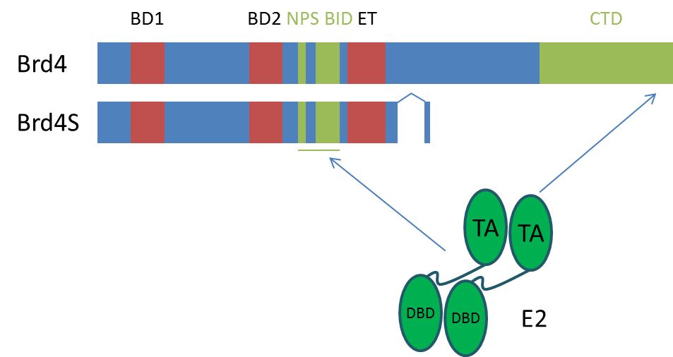 Papillomaviruses have coevolved with their hosts and use cellular factors to manipulate the host cell, enable viral replication and induce cancer. The viral E2 protein is necessary for viral genome replication via its interaction with the viral E1 replicative helicase. In addition, E2 is a transcriptional regulator of viral and host cell genes and is involved in the post-mitotic segregation of viral genomes. Transcriptional regulation by E2 is mediated via a highly conserved interaction with the bromodomain containing protein 4 (Brd4). The C-terminal domain (CTD) of Brd4 binds to highly conserved residues in the N-terminal domain of E2. Recent studies by Wu et al., 2016 suggested that Brd4 contains an additional interaction domain consisting of the NPS and BID domains that binds to E2 in a phosphorylation-dependent manner. Using flow cytometry-based FRET assays and co-immunoprecipitation assays, we can confirm that E2 proteins interact with the Brd4 NPS/BID domain and, consistent with this, with Brd4S, an alternatively spliced isoform of Brd4 that lacks the CTD.