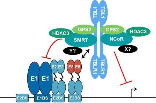 - we investigate the molecular repression mechanism by the E8^E2-NCoR/SMRT complex