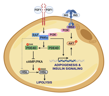 Previously, we identified a distinct FGF1 signaling pathway that mirrors insulin’s ability to suppress adipose lipolysis and hepatic glucose production (HGP). Specifically, FGF1/FGFR1 signaling in adipocytes activates PDE4D, leading to a reduction in cAMP levels and consequently decreased PKA activity. This results in diminished phosphorylation and translocation of hormone-sensitive lipase (HSL), effectively suppressing lipolysis. Now, we focus on further dissecting the signaling mechanisms by which the FGF1/PDE4D axis inhibits lipolysis, and we aim to define the in vivo contribution of adipose PDE4D to metabolic regulation, particularly its role in controlling lipolysis and HGP.