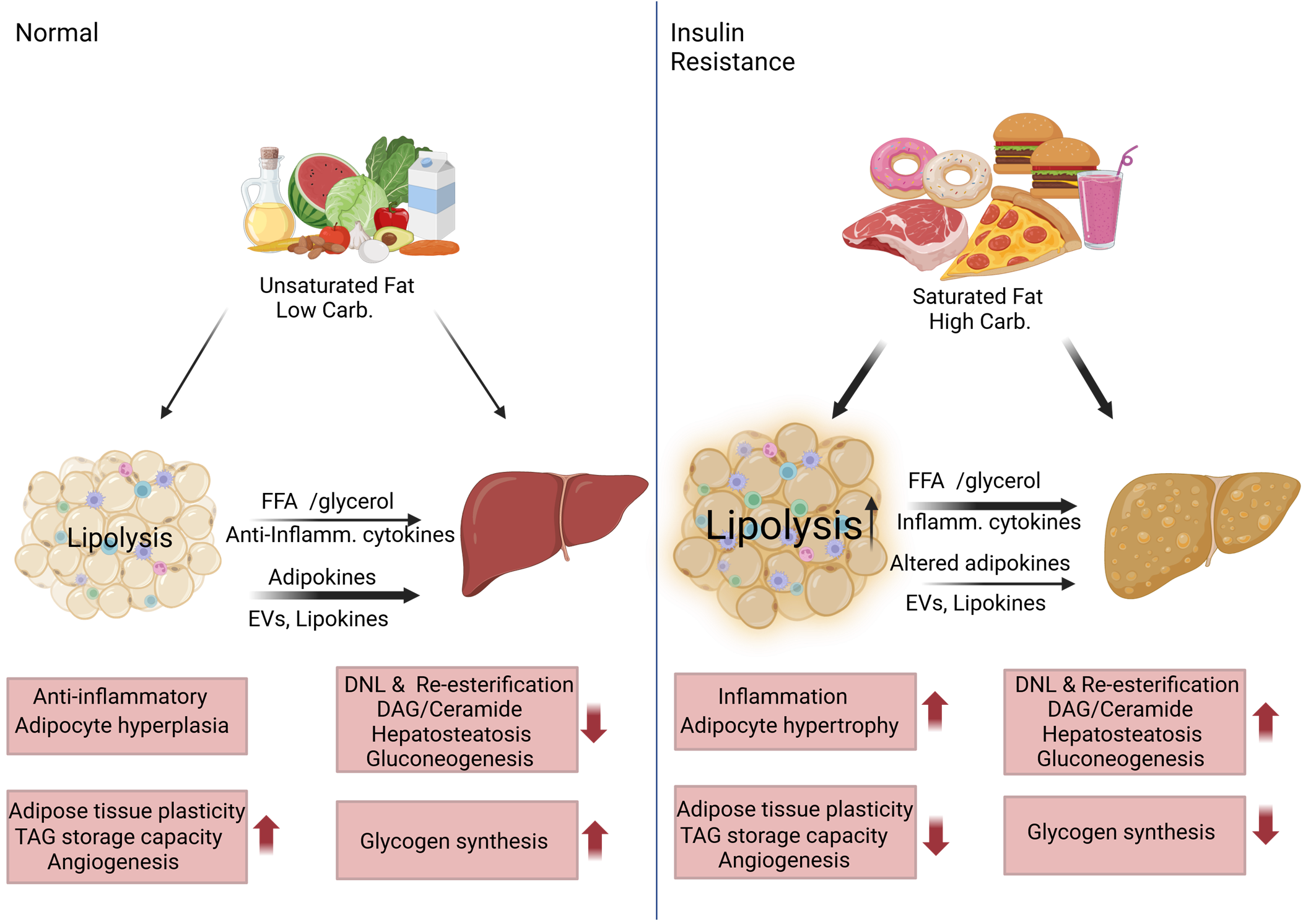 High-fat diet and sedentary lifestyle are key environmental factors that drive unhealthy expansion of adipose tissue and chronic inflammation, leading to adipose tissue dysfunction. Dysfunctional adipose tissue promotes cellular stress, inflammation, and lipotoxicity in other organs such as liver, which in turn exacerbates systemic insulin resistance. This whole-body insulin resistance is a central contributor to the development of prediabetes, type 2 diabetes, and other metabolic complications.