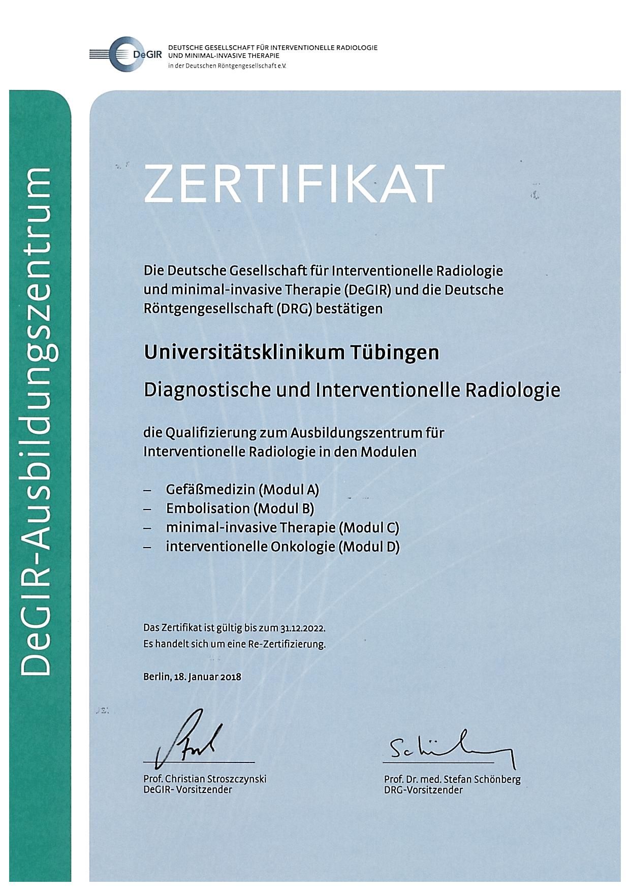 Die Abteilung für diagnostische und interventionelle Radiologie am Universitätsklinikum Tübingen bietet unseren Patientinnen und Patienten mit einem breit gefächerten interdisziplinären Team die bestmögliche Versorgung durch moderne bildgebende Diagnostik und schonende bildgesteuerte minimal-invasive Behandlungsverfahren. Wir versorgen unsere Patienten dabei an mehreren Standorten, nämlich in den Kliniken am Berg (Crona Kliniken, Medizinische Klinik, Kinderklinik) sowie in den Kliniken im Tal (Frauenklinik). Zusätzlich verantworten wir die bildgebende radiologische Versorgung der BG-Unfallklinik Tübingen in Kooperation mit dem Universitätsklinikum.