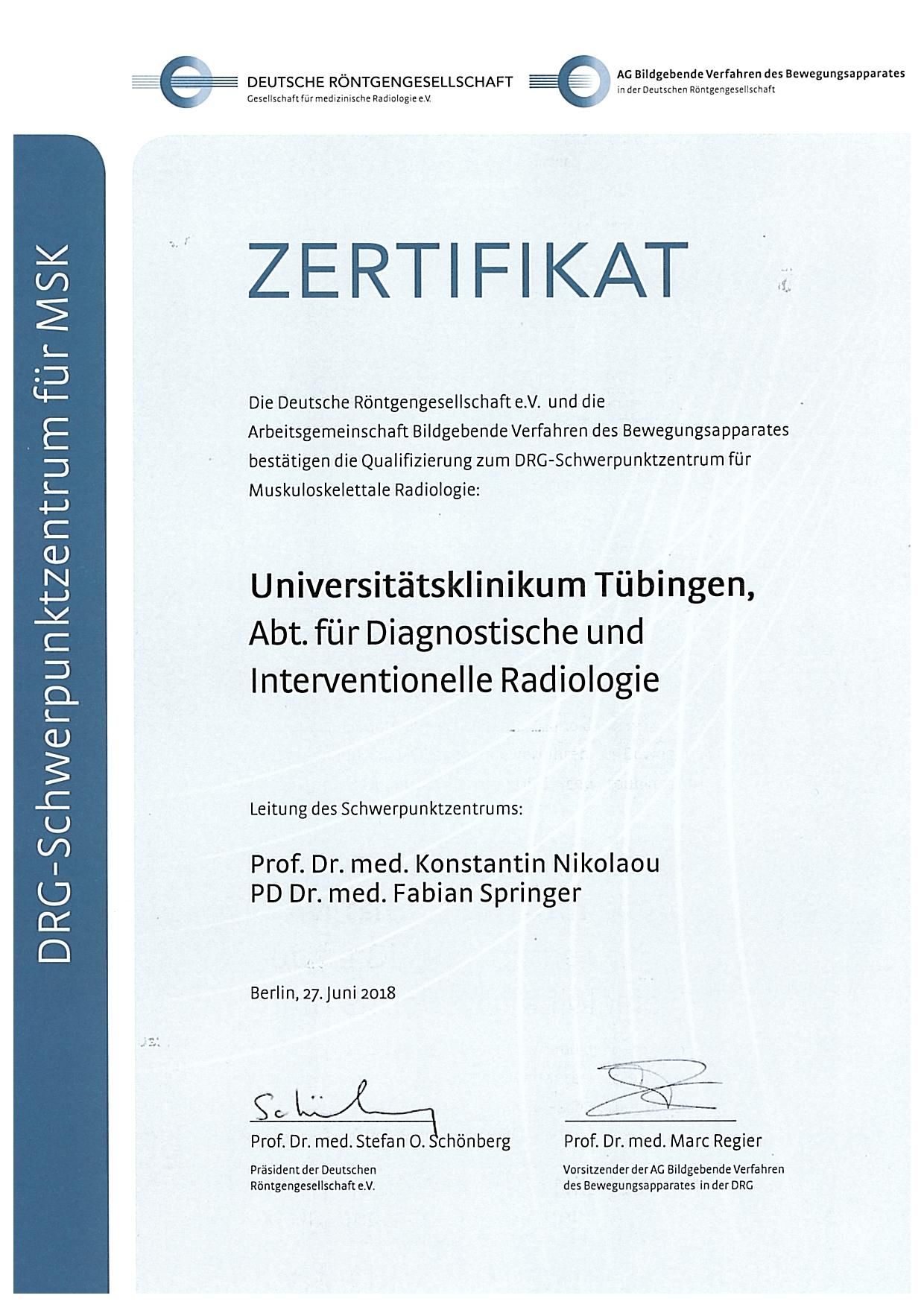 Die Abteilung für diagnostische und Interventionelle Radiologie des Universitätsklinikums Tübingen ist zusammen mit der Abteilung Radiologie der BG Unfallklinik Tübingen als Zentrum für Muskuloskelettale Radiologie von der deutschen Röntgengesellschaft (DRG) zertifiziert und deckt mit hoher Expertise das gesamte Gebiet der muskuloskelettalen Diagnostik und Therapie ab. Wir betreiben in diesem Rahmen sowohl Erstdiagnostik in der Akutsituation als auch die weiterführende Diagnostik für akute und chronische, erworbene und angeborene Störungen des Bewegungsapparates.