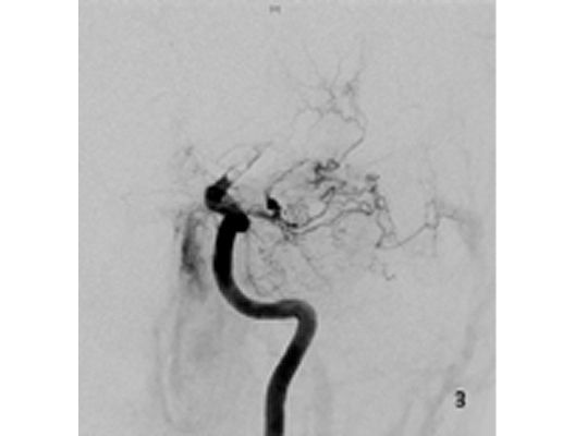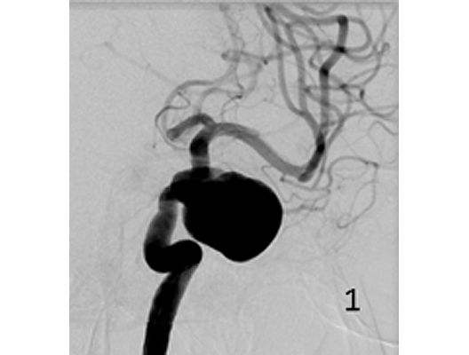 Das Beispiel zeigt die angiographischen Bilder einer Patientin, bei der es zu einer Sehstörung gekommen war. Die Ursache war ein großes Aneurysma der Halsschlagader an der Schädelbasis (Bild 1). Bild 2 zeigt die Lage des Aneurysmas hinter dem Auge. Durch den Druck des Aneurysmas auf den Sehnerv war es zu der Sehstörung gekommen. Die Patientin wurde mit einer speziellen Gefäßprothese versorgt, welche über eine Punktion der Leistenarterie in die Halsschlagader eingesetzt wurde (Bild 3). Bei der Kontrolle nach 6 Monaten zeigte sich ein vollständiger Verschluss des Aneurysmas (Bild 4). Die Sehstörung hatte sich vollständig zurückgebildet.