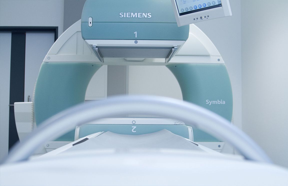 Die eigentliche Untersuchung findet mit einer Gamma-Kamera statt, in deren System auch ein CT integriert ist. Die Patienten werden meist auf einer Liege gelagert und in der Anlage optimal platziert. Die Anlage liefert ein Bild von der Verteilung des Medikamentes im Körper: Sie verarbeitet dafür die Gamma-Strahlen, die das radioaktive Medikament permanent aussendet. Zugleich hält sie mit dem CT die Knochen und Strukturen des Körpers fest. So kann man später sehr genau sehen, wo welches Detail liegt.