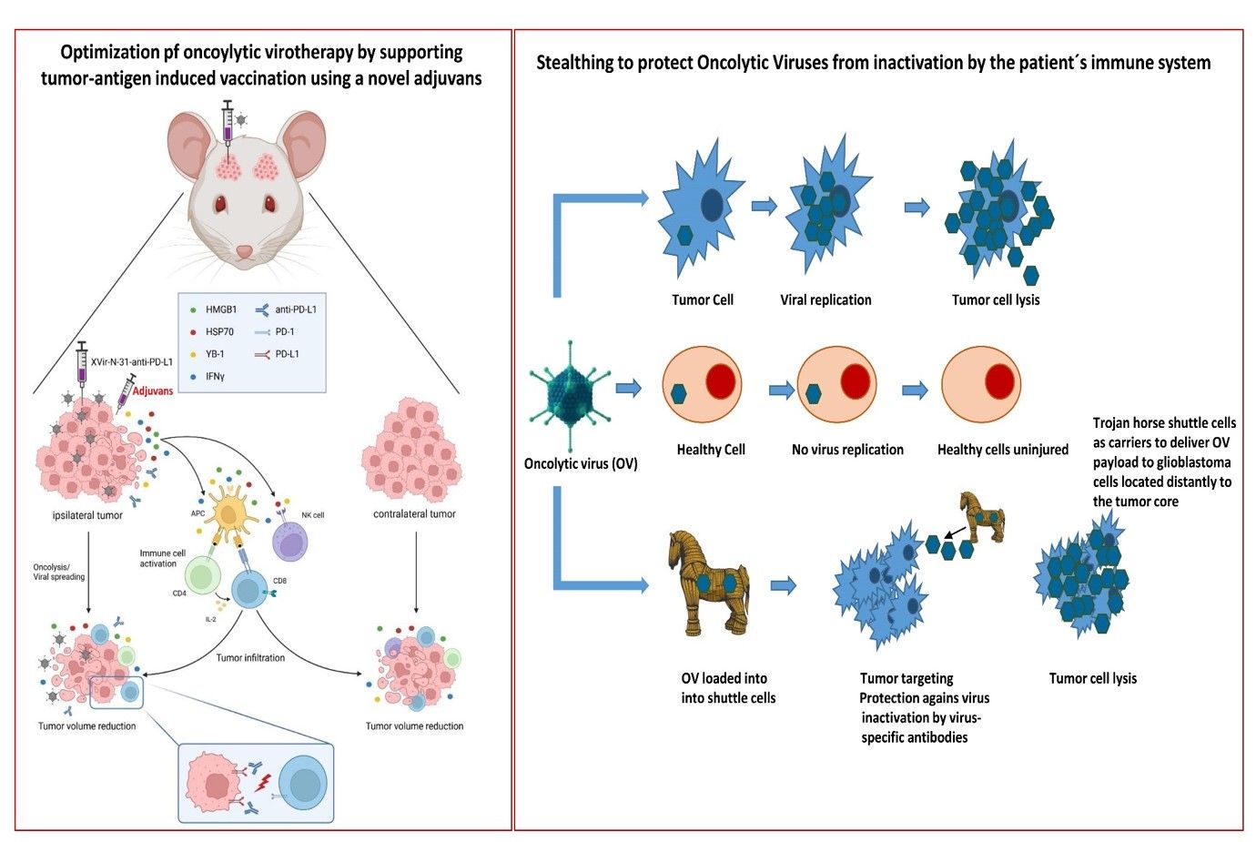 In another project in immunohumanized GBM bearing mice, we combined OVT with immune checkpoint inhibition using XVir-N-31-anti-PD-L1, an derivate of XVIr-N-31 that is armed to express a neutralizing antibody targeting the immune checkpoint protein PD-L1. A single intratumoral injection of XVir-N-31-anti-PD-L1 induced immunogenic cell death (ICD) in the tumor area, led to an elevated number of activated tumor infiltrating lymphocytes (TILs) and reduced the tumor growth significantly. Interestingly, this was no only the case for OV injected GBMs, but also for GBMs that grew in the contralateral hemisphere of the mice, therefore far away from the virus injection side, this mimicking healthy brain infiltrating GBM cells. In this ongoing project we recently started to optimize the OVT-mediated vaccination process that is induced by the release of tumor-(neo)-antigens (TAA) from virus-lysed GBM cells.