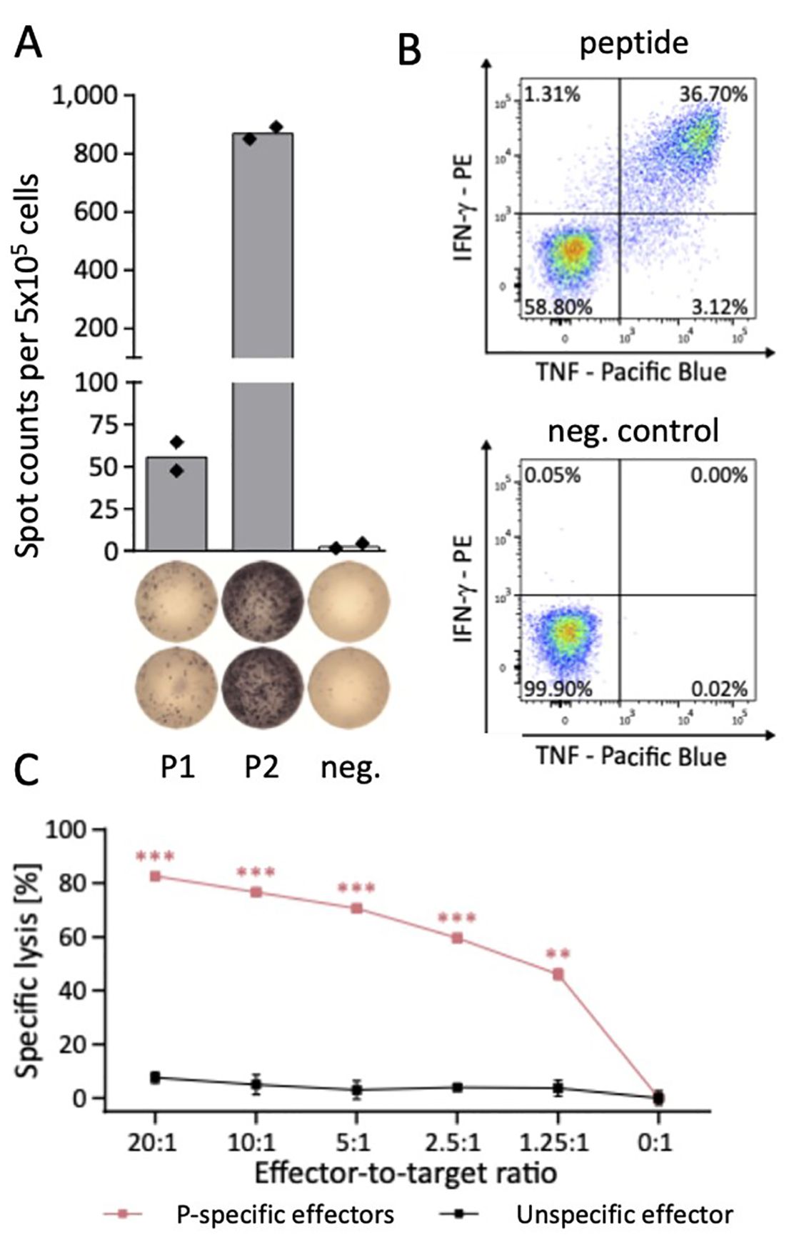 This workflow enables the identification of dominant and highly immunogenic CD8+ and CD4+ T cell epitopes. Immunogenicity screening T cell epitopes is performed by IFN-γ enzyme-linked immunospot (ELISPOT) representing a well-established, highly sensitive method for the high throughput screening of T cell epitopes (Fig. 1A).