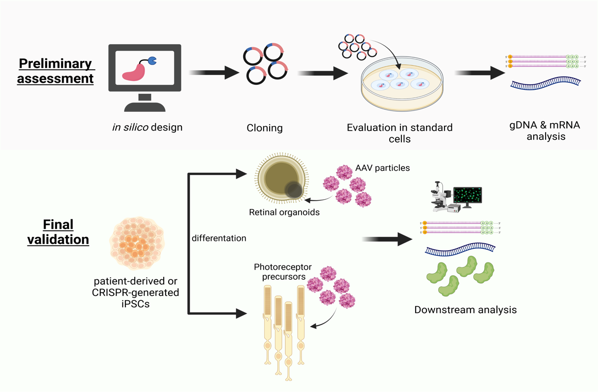 Beyond our contribution to in-house clinical translation programs in supplementation gene therapy for inherited retinal disorders (IRDs), we are exploring and developing innovative genome-editing approaches, which offer safer profile and overcome most of the current hurdles (e.g. use of multiple gRNAs, over activation of P53 pathways, chromosomal aberrations etc.). Specifically, we are applying Enhanced-Deletion RNA-guided endonuclease molecules coupled to single gRNAs to rescue aberrant splicing due to pathogenic (deep-) intronic variants in important IRD genes (ABCA4 and USH2A) as well as to selectively disrupt mutant RHO alleles linked to dominant inherited Retinitis Pigmentosa. Such editing approaches are preclinically validated in patient-derived cellular models. Moreover, we exploit antisense oligonucleotides as therapeutic agents to rescue certain splicing defects linked to IRDs and inherited optic neuropathies.