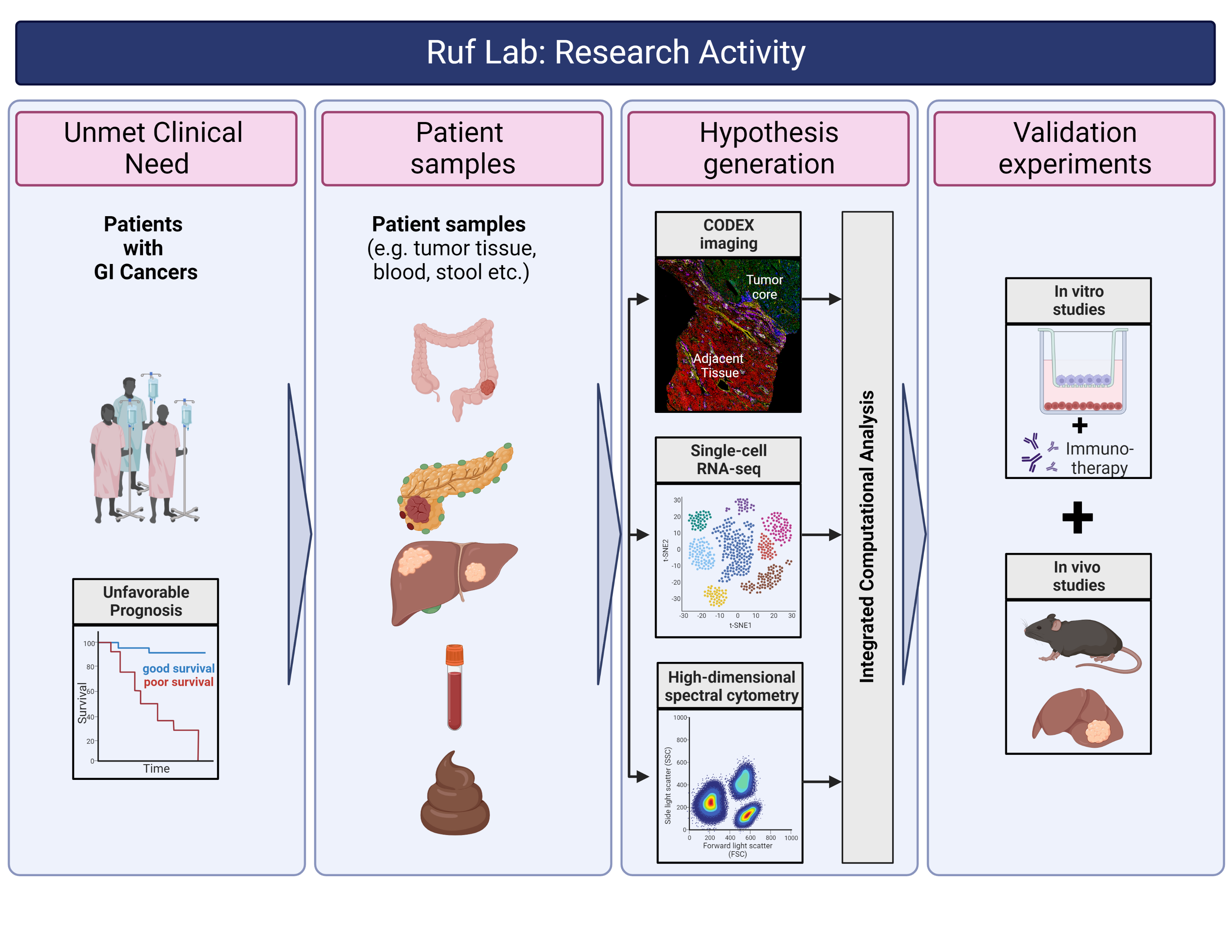 In our lab, we aim to expand our knowledge of the composition, phenotype, and organization of the tumor immune microenvironment (TiME) in gastrointestinal cancers with the goal to ultimately improve patient care. Our research is located at an exciting interface between basic immunology, translational and clinical research. We use clinical data to guide our research focus, we use systems biology approaches to build hypotheses and then test these hypotheses in functional in vivo and in vitro models. We employ complementary experimental strategies to investigate the TiME in patient samples including scRNA-seq, spatial proteomics and high-dimensional spectral cytometry. Using these approaches, we study how reciprocal communications between the innate and adaptive immune system, stomal cells and cancer cells are altered in response to tumor initiation, progression, and response to (immuno)therapy. One focus of our research program is to investigate the role of tissue-resident lymphocytes, in particular mucosal-associated invariant T (MAIT) cells, in the context of cancer. Beyond that and following up on previous studies, we continue to explore how the liver as a site of primary tumorigenesis or metastasis represents a unique tumor microenvironment that requires special consideration.