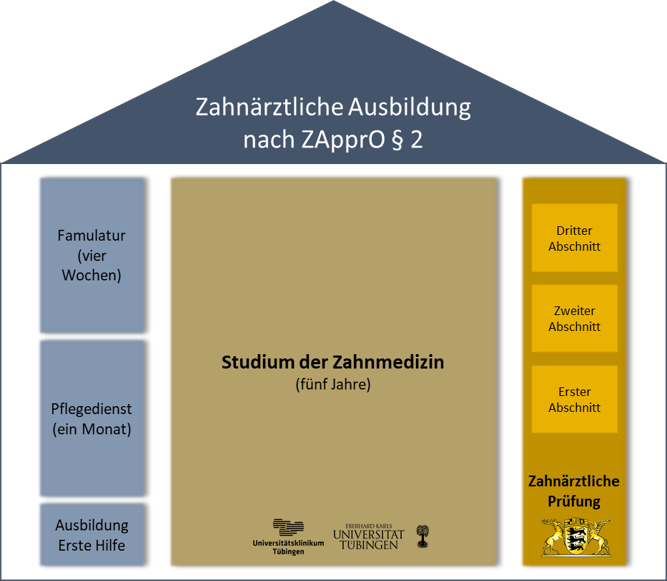Die zahnärztliche Ausbildung besteht aus fünf Teilen die alle erfolgreich absolviert werden müssen, um die Approbation zum Zahnarzt/ zur Zahnärztin – d.h. die staatliche Erlaubnis zur Ausübung der zahnärztlichen Tätigkeit – zu erhalten: den größten Teil umfasst dabei (1) das Studium der Zahnmedizin, das im Regelfall fünf Jahre dauert und mit einem zusätzlichen Examenssemester abgeschlossen wird. Unabhängig vom Studium muss zudem (2) eine Ausbildung in erster Hilfe, (3) ein einmonatiger Pflegedienst und (4) eine Famulatur im Umfang von vier Wochen im Rahmen der Zahnärztlichen Ausbildung absolviert bzw. nachgewiesen werden. Neben mündlichen und schriftlichen Prüfungen, die im Zuge des Studiums an der Universität Tübingen ablegt werden, gibt es noch (5) die staatliche Zahnärztliche Prüfung, die in drei Abschnitte unterteilt ist und jeweils am Ende des Vorklinischen, Präklinischen und Klinischen Studienabschnitts abzulegen ist. Diese staatlichen Prüfungen werden für die Zahnmedizin-Studierenden in Baden-Württemberg durch das Regierungspräsidium Stuttgart verwaltet.
